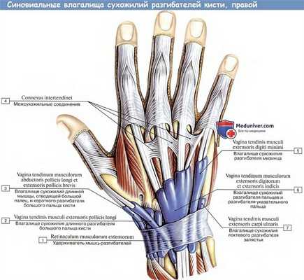 В первом канале (считая от лучевого края) проходят сухожилия m. abductor pollicis longus и m. extensor pollicis brevis; во втором (иногда двойном) — сухожилия mm. extensores carpi radiales longus et brevis; в третьем, перекрещивающем наискось предыдущий, — сухожилие m. extensor pollicis longus; в четвертом—сухожилия m. extensor digitorum и m. extensor indicis; в пятом, расположенном более поверхностно, — сухожилие m. extensor digiti minimi и, наконец, в шестом — сухожилие m. extensor carpi ulnaris.