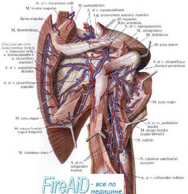 По ходу дельтовидно-грудной борозды проецируется латеральная подкожная вена руки, v. cephalica. По вертикальной линии, опущенной вниз от задненаружного угла акромиона до пересечения с задним краем m. deltoideus (в среднем 6 см; при отведении верхней конечности от туловища до прямого угла это расстояние будет равно 2,5—3,0 см), проецируется сосудисто-нервный пучок области — n. axillaris et aa. circumflexae humeri anterior et posterior. На этом же уровне находится хирургическая шейка плеча.