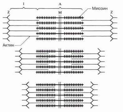 Основное положение теории скользящих нитей - во время скольжения (сокращения) сами актиновые и миозиновые нити не укорачиваются, так как ширина диска А остается при сокращении постоянной, а І-диски и Н-зоны становятся более узкими или совсем исчезают. Длина протофибрилл не изменяется и при растяжении мышцы. Вместо этого пучки тонких нитей, скользя, выходят из промежутков между толстыми нитями, так что степень их перекрытия уменьшается