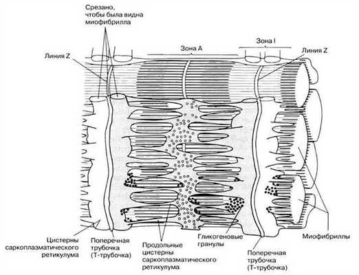 Группа миофибрилл образует симпласт. На поверхности мышечной клетки плазматическая мембрана (сарколемма) образует впячивания, где формируется система Т-трубочек, обеспечивающая сокращение миоцитов. Представляет собой сеть взаимосвязанных колец, каждое из которых окружает миофибриллу и обеспечивает важный путь коммуникации между наружной частью волокна и миофибриллами, которые расположены глубоко внутри волокна.