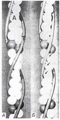 В средней части толстой нити молекулы собраны в хвост-хвост. Вдоль остальной части нити наматываются с головы до хвоста. Хвостовые части молекул образуют сердцевину нити; головные части выступают из нити.