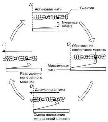 При сокращении мышцы длина актиновых и миозиновых нитей не изменяется. Происходит лишь их смещение относительно друг друга: тонкие нити задвигаются в промежуток между толстыми. Такое скольжение оказывается возможным благодаря существованию поперечных мостиков (миозиновых головок) между толстыми и тонкими нитями. Миозиновая нить имеет на себе множество головок, которыми она может связываться с актином. Актиновая же нить, в свою очередь, имеет участки (активные центры), к которым могут прикрепляться головки миозина. В покоящейся мышечной клетке эти центры связывания прикрыты молекулами тропомиозина, что препятствует образованию связи между тонкими и толстыми нитями.