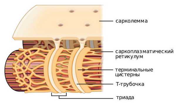 Другая мембранная система, которая окружает каждую миофибриллу — саркоплазматический ретикулум, образующий ряд закрытых мешковидных мембран. Участок, контактирующий с Т-трубочкой, образует увеличенный мешок, называемый терминальной цистерной. У большинства позвоночных каждая Т-трубочка имеет две цистерны, тесно связанные с ней, образуя трехэлементный комплекс, называемый триадой. Количество триад на саркомер зависит от вида. Например, в мышце лягушки есть одна на триаду, а в мышцах млекопитающих — две. У рыб и ракообразных только одна цистерна связана с каждой поперечной трубочкой, образуя диаду.