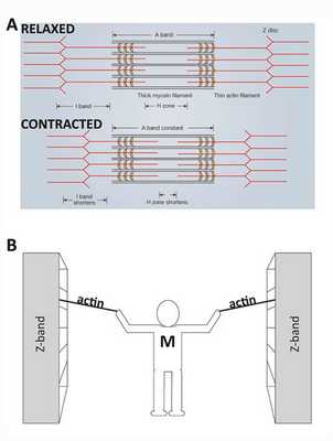 Представьте, что вы стоите между двумя большими шкафами с книгами. Они находятся на расстоянии нескольких метров друг от друга и расположены на рельсах, так что их можно легко перемещать. Вам дается задача объединить два книжных шкафа, но вы ограничены использованием только ваших рук и двух веревок. Стоя в центре между книжными шкафами, вы тянете за две веревки (по одной на руку), которые надежно привязаны к каждому книжному шкафу. Повторяющимися движениями вы подтягиваете каждую веревку к себе, перехватываете ее, а затем снова тянете. В конце концов книжные шкафы движутся вместе и приближаются к вам. В этом примере ваши руки похожи на молекулы миозина, веревки — это актиновые нити, а книжные шкафы — это z-диски, на которых закреплен актин и которые составляют боковые концы саркомера. Подобно тому, как вы остаетесь в центре между книжными шкафами, миозиновые нити остаются центрированными во время нормального сокращения мышц.