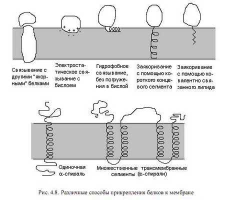 Принято делить мембранные белки на 2 группы: интегральные(внутренние) и периферические (наружные). Критерием такого разделения служит степень прочности связывания белка с мембраной и, соответственно, степень жесткости обработки, необходимой для извлечения белка из мембраны. Так, периферические белки могут высвобождаться в раствор уже при промывке мембран буферными смесями с низкой ионной силой, низкими значениями рН в присутствии хелатирующих веществ, например этилендиаминотетраацетата (ЭДТА), связывающих двухвалентные катионы. Периферические белки выделяются из мембран при таких мягких условиях, поскольку связаны с головками липидов или с другими белками мембраны при помощи слабых электростатических взаимодействий, либо с помощью гидро-фобных взаимодействий — с хвостами липидов. Наоборот, интегральные белки представляют собой амфифильные молекулы, имеют на своей поверхности большие гидрофобные участки и располагаются внутри мембраны, поэтому для их извлечения требуется разрушить бислой. Для этих целей наиболее часто используют детергенты или органические растворители. Способы прикрепления белков к мембране довольно разнообразны (рис. 4.8).