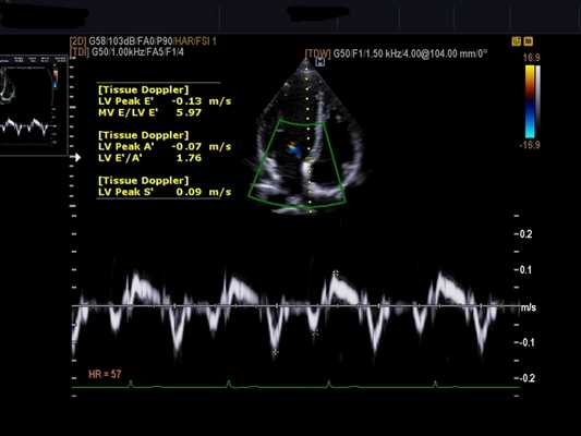 Эходопплерография и цветное допплеровское изображение дают важную гемодинамическую информацию, которая поможет в оценке давления наполнения ЛЖ, стратегии управления и прогноз. Пациенты с компенсацией по гемодинамике с практически нормальным ударным объемом сердечного выброса и нарушением релаксации в диастолу (1 класс диастолической дисфункции). Пациенты, которые имеют более тяжелые формы декомпенсированной кардиомиопатии снижается ударный объем (интеграл линейной скорости кровотока уменьшается) и имеется ограничительный паттерн диастолического наполнения ЛЖ (класс 3-4 диастолической дисфункции) из-за снижения соответственно притока и увеличения давления наполнения ЛЖ. Развитие диастолической дисфункции с нарушением паттерна ограничительной релаксации при диастолическом заполнении было элегантно продемонстрировано на животных моделях с тахи-индуцированными кардиомиопатиями. Различные критерии переменных диастолического наполнения ЛЖ, которые имеют хорошую корреляцию с легочным капиллярным давлением заклинивания, имеют дополнительную прогностическую ценность вместе теми показателями, которые обеспечивают расчет фракции выброса. Чем короче время изоволюмического расслабления (ДТ) (т. е., более ограничительный характер диастолического наполнения) и выше, Е/Е' (т. е. выше давление заклинивания в легочных капиллярах), тем хуже прогноз. В качестве примера, если пациент лечится от сердечной недостаточности, нарушение диастолического наполнения ЛЖ становится менее строгим и ДТ возрастает. Сохранение ограничительного наполнения после терапии связано с высоким уровнем смертности и определяет показания к трансплантации сердца. У пациентов с обратимой дисфункцией ограничительного заполнения имеют высокую вероятность улучшения и отличное выживание.