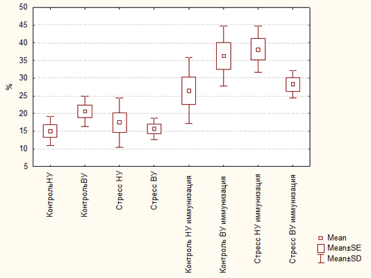 У НУ нестрессированных животных отмечается более высокий уровень Th-1 и Th-2-зависимого иммунного ответа. Об этом свидетельствуют повышенное содержание АОК и увеличение интенсивности ГЗТ.