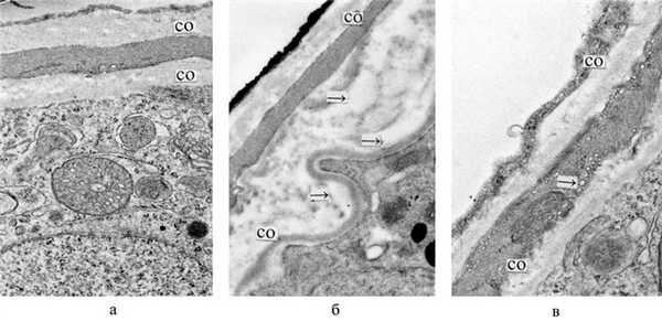 Лечебно-профилактическое применение НИ ЭМИ после действия стресса также вызывало ослабление ряда постстрессорных нарушений и усиление адаптационно-компенсаторных реакций. В семенниках это проявлялось в улучшении процессов сперматогенеза к 9-м суткам после стресса: число ИСК с 4 генерациями клеток возрастало на 48,0% (р<0,05), а число ИСК с 3 генерациями уменьшалось на 18,6% (р<0,05), что приближало эти показатели к уровню интактных животных (см. таблицу). Следует также отметить, что в отличие от контроля у животных опытной группы отсутствовали ИСК с 1 и 2 генерациями, что указывало на снижение уровня деструктивных процессов в сперматогенных клетках. Положительные изменения отмечались со стороны гематотестикулярного барьера, при этом уменьшалась толщина собственной оболочки ИСК и ее отдельных слоев, отчетливо ослаблялись локальные отеки, которые не были столь выражены, как у животных контрольной группы (рис. 4). Рисунок 4. Ультраструктурные изменения собственной оболочки ИСК при иммобилизационном стрессе и действии НИ ЭМИ. а - интактная крыса. Собственная оболочка ИСК; б - иммобилизационный стресс. Контроль. Утолщение собственной оболочки ИСК, в основном за счет выраженного отека ее внутреннего неклеточного слоя, видны мелкие локальные скопления отечной жидкости (стрелки); в - иммобилизационный стресс. Влияние НИ ЭМИ после действия стресса. Улучшение ультраструктуры собственной оболочки ИСК-ослабление явлений отека, уменьшение общей ее толщины. На данном участке собственной оболочки сохраняются процессы повышенного везикулообразования (стрелка). ×18 000. СО - собственная оболочка. Местами выявлялась активация процессов регенерации в миоидных клетках собственной оболочки в виде увеличения белоксинтезирующих органелл. Все эти благоприятные сдвиги свидетельствовали о снижении проницаемости барьерных структур и об улучшении процессов микроциркуляции. На этом фоне АОА повышалась на 24,2% (р<0,01), а содержание общего белка на 44,1% (р<0,01) (см. рис. 1, б). В печени усиление АОА на 45,4% (р<0,05) (рис. 2, б) сочеталось с повышенным уровнем ПОЛ на 61,1% (р<0,01), при этом окислительный потенциал (ПОЛ/АОА; р=0,05) становился ниже уровня контроля.
