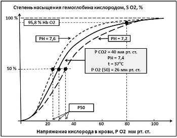 Данный показатель определяется в микропробе артериальной крови и отражает сродство гемоглобина к кислороду. Нормальные значения данного показателя - 26 - 27 мм рт. ст. Уменьшение значения Р50 соответствует сдвигу кривой диссоциации оксигемоглобина влево и соответственно увеличению сродства гемоглобина к кислороду, увеличение Р50 свидетельствует о сдвиге кривой диссоциации оксигемоглобина вправо с уменьшением сродства гемоглобина к кислороду (рис. 4).