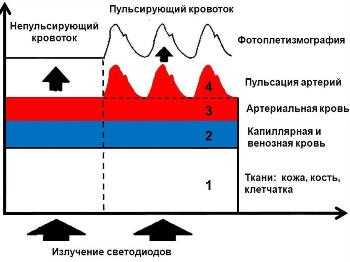 Еще одним важным достоинством регистрации фотоплетизмограммы является возможность выделить долю интенсивности светового потока, который поглощается непосредственно гемоглобином артериальной крови. При прохождении света через участок ткани он встречает различные препятствия, которые условно можно разделить на несколько слоев (рис. 3). Слой 1 - это ткани (кожа, подкожная клетчатка, ноготь, кость), слой 2 - капиллярная и венозная кровь, слой 3 - кровь, остающаяся в артериолах к концу каждой пульсации, своего рода «конечно-систолический объем» артериального русла, слой 4 - дополнительный объем артериальной крови, притекающий в артериолы во время систолы сердца.