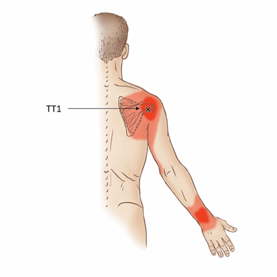 - ТТ1 - рядом с латеральной границей лопатки в подлопаточной ямке. Триггерные точки можно обнаружить в подлопаточной ямке медиально в направлении верхнего угла лопатки.