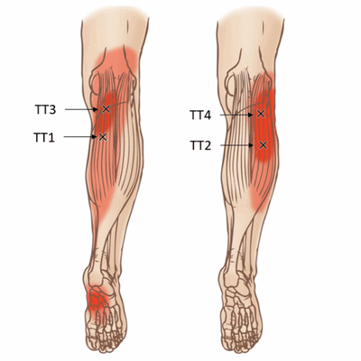 - ТТ1 и ТТ2 - проксимально от середины брюшков мышц, по одной триггерной точке на внутренней и наружной головках икроножной мышцы;