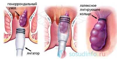 Лигирование (перетягивание) геморроидальных узлов латексными кольцами хоть и возможно на более поздних стадиях (при выпадении геморроидального узла), однако противопоказано при трещинах, воспалении и тромбозе. Следовательно, набрасывание эластичных колец, которые приведут к самостоятельному отпадению узла в результате нарушения кровоснабжения в нем, в отношении тромбированных узлов не практикуется.