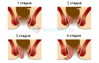 Стадии развития неосложненного геморроя. На четвертой - максимальный риск возникновения тромбоза