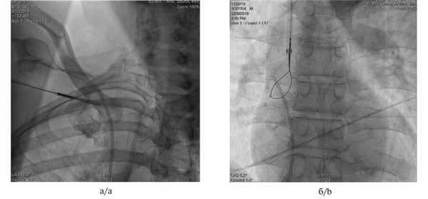 У 3 больных с миграцией катетера, переведенных из других лечебных учреждений, в условиях рентгенооперационной выполнена операция эндоваскулярного удаления инородного тела (рис. 3). Рис. 3. Рентгенограммы органов грудной клетки во время удаления катетера с использованием ретривера с крючками (grab retriever) — а и ретривера петля (loop retriever) — б. Во всех наблюдениях использован доступ через правую бедренную вену. Его пришлось дополнить доступом через правую подключичную вену в одном наблюдении и через правую внутреннюю яремную вену в другом. Использованы ретривер петля (loop retriever) и ретривер с крючками (grab retriever). После нескольких попыток инородное тело удалось захватить ретривером и удалить через доступ в бедренной вене. Послеоперационный период протекал без осложнений, больные выписаны на 2—3-и сутки.