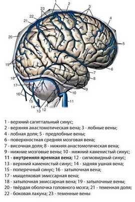 Внутренняя яремная вена получает кровь из внутри- и внечерепных притоков. Внутричерепные сосуды переносят кровь из черепной полости, мозга, глаз и ушей. К ним относят: