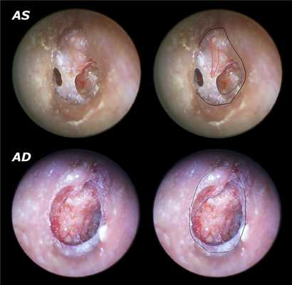 AS — левое ухо, AD — правое ухо. Черными линиями выделены контуры костного барабанного кольца; синими — границы перфорации; красными — слуховые косточки.