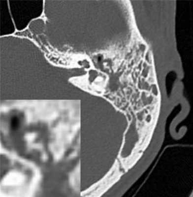 На серии снимков аксиальной компьютерной томографии с последующей трехмерной реконструкцией визуализируются типичные признаки среднего отита: тотальное снижение пневматизации ячеек сосцевидного отростка, антрума и барабанной полости за счет патологического содержимого мягкотканной плотности, без явных признаков некроза височной кости: деструктивных изменений ячеистой структуры сосцевидного отростка, наличия секвестров. Отмечаются также и определенные изменения, нехарактерные для типичной клинической картины среднего отита, но являющиеся сугубо специфическими: наковальня (тело) и молоточек (головка) представляются выраженно кариозно измененными (рис. 2).