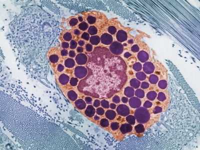Строение тучной клетки типично: ядро, цитоплазма с заключенными в ней органеллами, мембрана. На поверхности мембраны расположены особые рецепторы - участки, к которым «приклеиваются» иммуноглобулины Е. Сами клетки очень маленькие, но, невзирая на это, на каждой из них располагается 50-300 000 рецепторов.