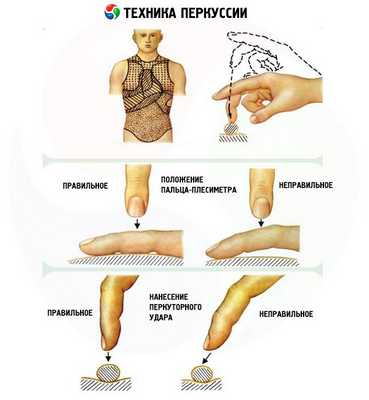 Перкуссия проводится для того, чтобы выявить изменения физических свойств (соотношение воздуха и плотных элементов) органа или его части (сравнительная перкуссия) или определить границы органа и зоны измененных физических свойств (топографическая перкуссия).