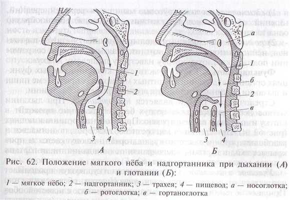 Стрелочником глотки является надгортанник. При дыхании мягкое нёбо опускается и воздух беспрепятственно проходит в глотку и гортань и далее в трахею. При этом надгортанник поднят (рис. 62, А). При глотании мягкое нёбо, наоборот, поднимается и разобщает рото- и носоглотку, надгортанник опускается и прикрывает вход в гортань, предохраняя от попадания пищи гортань и далее дыхательные пути (рис. 62, Б).