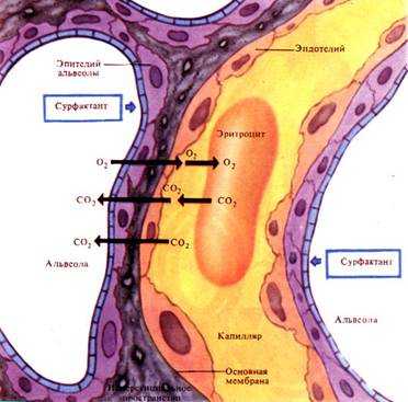 Парциальное давление углекислого газа в альвеолярном воздухе составляет 40 мм рт.ст., а его напряжение в притекающей к легким венозной крови — 46 мм рт.ст. Вследствие разности давлений углекислый газ переходит в альвеолы.