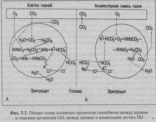 и углекислого газа, происходящих во время прохождения крови в капиллярах тканей и легких, представлена на рис. 7.7.