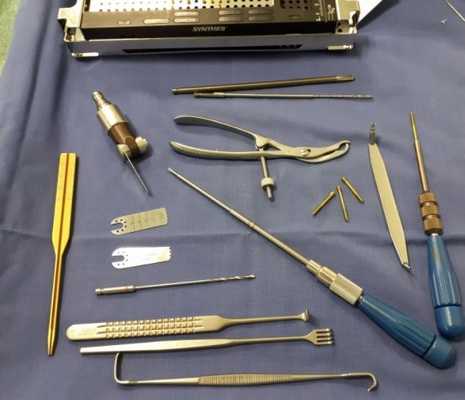 Сломанная кость обнажается, производится сопоставление костных отломков, временная фиксация при помощи костодержателей, спиц, костных цапок. Далее выполняется остеосинтез при помощи пластин и винтов. Временная фиксация удаляется.