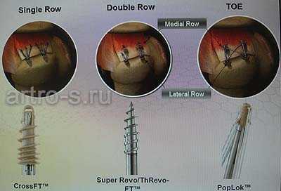 Для фиксации сухожилий применяются специальные якорные фиксаторы с прочными нитями, при помощи которых формируется один или два ряда швов. (single and double row)