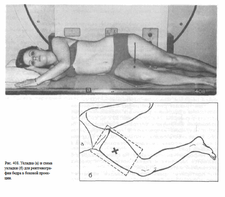 Рис. 406, Укладка для рентгенографии бедра в прямой задней проекции.