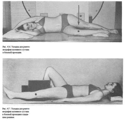 Укладка больного для выполнения снимка такая же, как для рентгенографии коленного сустава в боковой проекции. Однако в данном случае с целью ротации голени пятку исследуемой конечности значительно приподнимают вверх, подкладывая под нее мешочки с песком. При этом суставная щель между головкой малоберцовой кости и латеральным мыщелком большеберцовой кости устанавливается перпендикулярно к кассете.