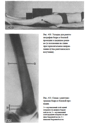 лярна плоскости стола. Ось бедра снимаемой конечности соответствует средней линии деки. Кассету размером 24 х 30 см или половину кассеты размером 30X40 см располагают в плоскости стола с таким расчетом, чтобы на снимке получили отображение либо оба, либо хотя бы один метаэпифиз бедренной кости, что необходимо для правильной ориентации концов снятого участка бедра (рис. 406). Пучок рентгеновского излучения направляют