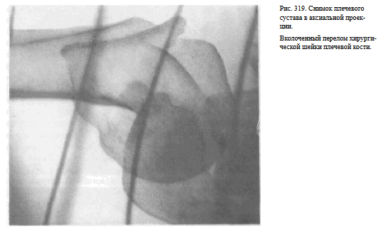 При невозможности отвести руку в плечевом суставе для выполнения аксиального снимка, а также при переломах проксимального отдела плечевой кости, когда отведение в плечевом суставе противопоказано из-за возможности еще большего смещения отломков, боковые снимки вполне могут заменить собой снимки в аксиальной проекции. Наиболее щадящим для больного является выполнение трансторакального снимка плечевого сустава, при котором никаких движений в плечевом суставе не производят.
