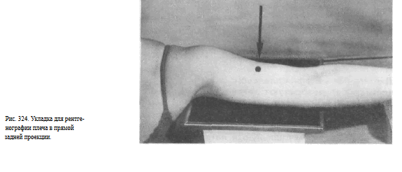Кисть — в положении пронации. Кассету размером 18X24 см подкладывают под снимаемое плечо. Короткий край ее находится в подмышечной впадине. Пучок рентгеновского излучения направляют отвесно, в центр кассеты (рис. 327).