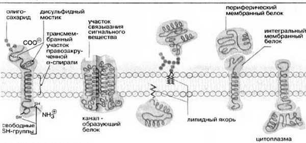 В строении мембран выделяют специфические рецепторы, транспортирующие электроны, ферментные белки. Благодаря белкам обеспечивается транспорт некоторых молекул в клетку и обратно, осуществляется структурная связь цитоскелета с клеточными мембранами. Белки выполняют функции рецепторов — они получают или преобразуют химические сигналы окружающей среды.