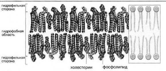 Плазматическая мембрана состоит из двух рядов липидов, молекулы которых располагаются таким образом, что неполярные гидрофобные концы находятся в глубине мембраны, а полярные гидрофильные концы — направлены на внешнюю и внутреннюю среду.