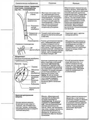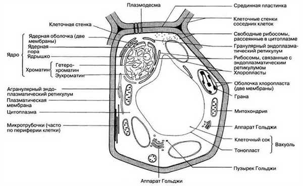 Рассмотрим клетку как структурно-функциональную единицу организма. Снаружи клетка покрыта плотной клеточной стенкой, в которой имеются более тонкие участки — поры. Под ней находится очень тонкая плёнка — мембрана, покрывающая содержимое клетки — цитоплазму. В цитоплазме есть полости — вакуоли, заполненные клеточным соком. В центре клетки или около клеточной стенки расположено плотное тельце — ядро с ядрышком. От цитоплазмы ядро отделено ядерной оболочкой. По всей цитоплазме распределены мелкие тельца — пластиды.