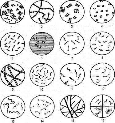 5— пневмококки; 6— капсулы пневмококков; 7— коринебактерии дифтерии; 8 — клостридии; 9 — бациллы; 10 — вибрионы; 11 — спириллы; 12 — трепонсмы; — боррелии; 14 — лептоспиры; 15— актиномицеты; 16 — расположение жгутиков: а — монотрихи; б — лофотрихи; в — амфитрихи; г — перитрихи