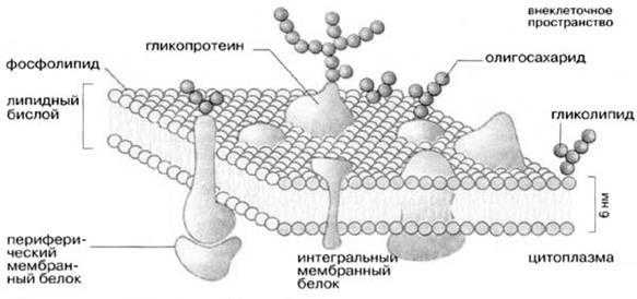 Молекулярная организация плазматической (клеточной) мембраны у всех клеток примерно одинакова: она состоит из двух слоев липидных молекул с множеством включенных в нее специфических белков. Одни мембранные белки обладают ферментативной активностью, тогда как другие связывают питательные вещества из окружающей среды и обеспечивают их перенос в клетку через мембраны. Мембранные белки различают по характеру связи с мембранными структурами. Одни белки, называемые внешними или периферическими, непрочно связаны с поверхностью мембраны, другие, называемые внутренними или интегральными, погружены внутрь мембраны. Периферические белки легко экстрагируются, тогда как интегральные белки могут быть выделены только при помощи детергенов или органических растворителей. На рис. 4 представлена структура плазматической мембраны.