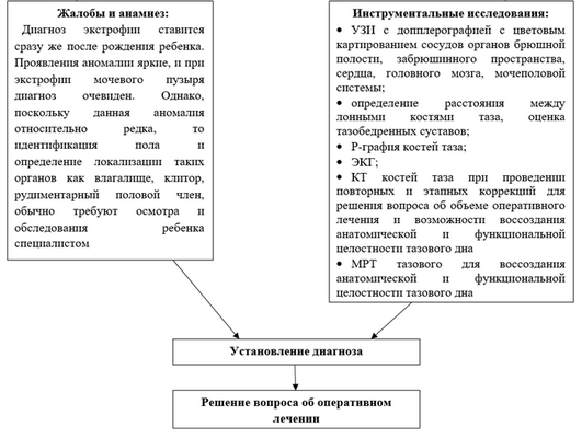 Диагноз экстрофии ставится сразу после рождения ребенка. Проявления аномалии яркие, и при экстрофии мочевого пузыря диагноз очевиден. Однако, поскольку данная аномалия относительно редка, то идентификация пола и определение локализации таких органов как влагалище, клитор, рудиментарный половой член, обычно требуют осмотра и обследования ребенка специалистом [7].