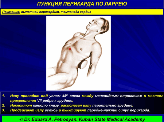 5. Пункция полости перикарда: показания, точки пункции, техника пункции по Ларрею.