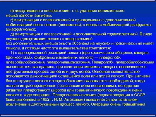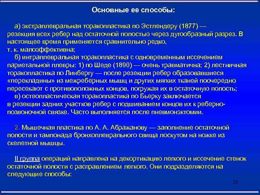 Большие операции - торакотомия и резекция легкого, бронха; медиастенотомия - пластика пищевода, операции на сердце и т.д.