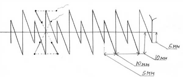 Сущность способа состоит в том, что после шва брюшины апоневроз лапаротомной раны ушивают укрепляющими швами, расстояние между которыми составляет 5 см, затем накладывают непрерывный шов с расположением стежков в шахматном порядке — непрерывный шахматный шов (рис. 1). Рис. 1. Схема наложения непрерывного шахматного шва на апоневроз.