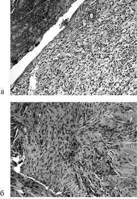 Рис. 3. Микрофотография отдельного шва на 7-е (а) и 14-е (б) сутки. Окраска гематоксилином и эозином. Ув. 200.