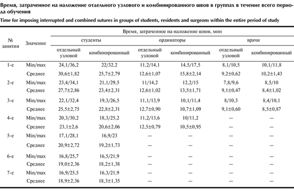Немаловажно, что в результате обучения время наложения отдельных узловых швов и восстановления апоневроза предлагаемым способом (сумма времени наложения шахматного и укрепляющих швов) в 1-й группе составило в среднем 18,9±2,36 и 18,3±1,35 мин, во 2-й группе — 12,5±0,79 и 10,5±0,95 мин, в 3-й группе — 9,1±0,6 и 8,5±0,87 мин. Предлагаемый способ по временны́м характеристикам не противоречит узловой лапарорафии (см. таблицу). Время, затраченное на наложение отдельного узлового и комбинированного швов в группах в течение всего периода обучения
