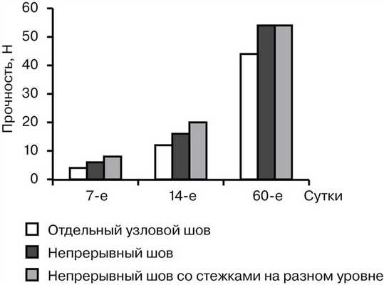 Тензиометрическое исследование показало, что на 7-е сутки прочность отдельного узлового шва составила от 2,7 до 5,8 Н (в среднем 3,94±0,9 Н), непрерывного шва — от 4,2 до 8,3 Н (в среднем 6,05±1,15 Н), непрерывного шва с расположением стежков на разном уровне — от 5,4 до 9,1 Н (в среднем 7,2±1,45 Н). К 14-м суткам наблюдалось увеличение прочности всех исследуемых швов. Показатель прочности отдельного узлового шва был от 11,7 до 16,6 Н (в среднем 13,9±1,7 Н), в случае непрерывного шва — от 13,7 до 20,5 Н (в среднем 17,3±2,2 Н), непрерывного шва с расположением стежков на разном уровне — от 19,1 до 24,5 Н (в среднем 21,35±1,57 Н). На 60-е сутки прочность отдельного узлового шва составляла от 31,3 до 50,2 Н (в среднем 43,8±6,2 Н), в случае обвивного шва — от 44,1 до 68,6 Н (в среднем 54,8±7,1 Н), непрерывного шва с расположением стежков на разном уровне — от 45,2 до 67,3 Н (в среднем 55,1±7,6 Н) (рис. 1).