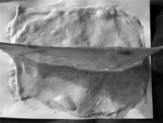 Взятие и подготовку апоневроза передней брюшной стенки к исследованию проводили по специально разработанной методике. На трупном материале по срединной линии передней брюшной стенки выполняли разрез кожи и подкожной жировой клетчатки от мечевидного отростка до лонного сочленения. Затем подкожную жировую клетчатку отсепаровывали от апоневроза до уровня передней подмышечной линии и производили забор мышечно-апоневротического фрагмента передней брюшной стенки, как показано на рис. 1. Рисунок 1. Этап подготовки апоневроза к исследованию.