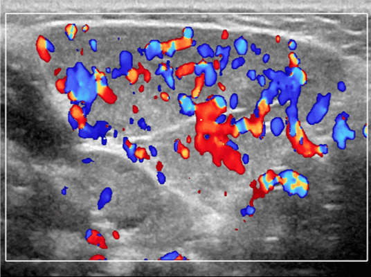 Лучшая диагностическая подсказка. Четко выраженная опухоль с диффузной гиперваскуляризацией внутри очага поражения / интенсивным усилением кровотока на УЗИ с ЦДК. Сосуды внутри и рядом с образованием во время фазы пролиферации (ФП). Уменьшение размера за счет замещения жировой ткани во время фазы инволюции (ФИ)