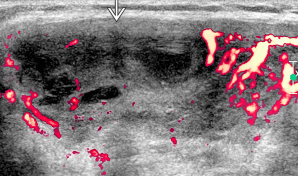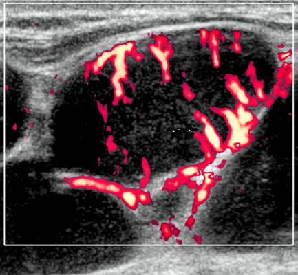 - Цветной допплер: смешанная васкуляризация с выраженным сосудистым рисунком и наличием периферической васкуляризации. Периферическая сосудистая сеть редко встречается в узлах НХЛ