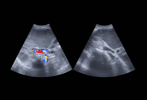 Гипоэхогенные регионы. В некоторых наклонных рекуррентных срезах на УЗИ желчный пузырь может давать вид округлого гипоэхогенного очага внутри паренхимы печени. Как только анатомия желчного пузыря становиться понятной, это не должно вызывать никаких проблем. Тем не менее, иногда, если есть сомнения, можно дать жирную пищу для сокращения желчного пузыря. Другие гипоэхогенные изображения в печени могут быть венозными. Возможно получить изображения поперечных срезов сосудов, которые имеют округлый вид и могут возникать из печеночных или портальных вен. Расширенные вены, особенно слияние средней и левой печеночных вен, могут также приводить к появлению кистозных поражений. Такая дилатация может встречаться даже при отсутствии стазиса. Различие между сосудами и кистозными поражениями легко сделать, изучая по УЗИ ход ветвление сосудов, а также их стенок или с помощью цветного ультразвукового допплера.